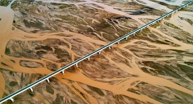 青藏铁路跨过沱沱河的辫状河道(2023年7月26日摄,无人机照片)。新华社记者 刘诗平 摄