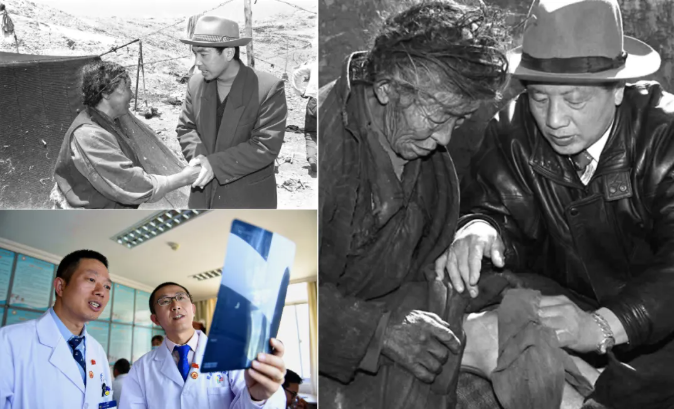 左上图为来自陕西的援藏干部、阿里日土县副县长贾冗勇深入牧区,帮助藏族牧民解决生产、生活的实际困难(新华社记者土登摄,1997年11月11日发);左下图为2017年8月3日,北京积水潭医院援藏医生龚晓峰(右)和北京天坛医院援藏医生李家谋在拉萨市人民医院骨科病房内查看患者的X光片(新华社记者晋美多吉摄);右图为孔繁森(右)在阿里日土县过巴乡为孤寡老人益西卓玛治病(新华社记者土登摄,1994年12月26日发)。