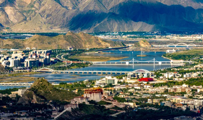 这是2025年7月30日拍摄的拉萨河风光,由近及远分别是连心桥、柳梧大桥、和美桥和青藏铁路拉萨河特大桥。新华社记者 姜帆 摄