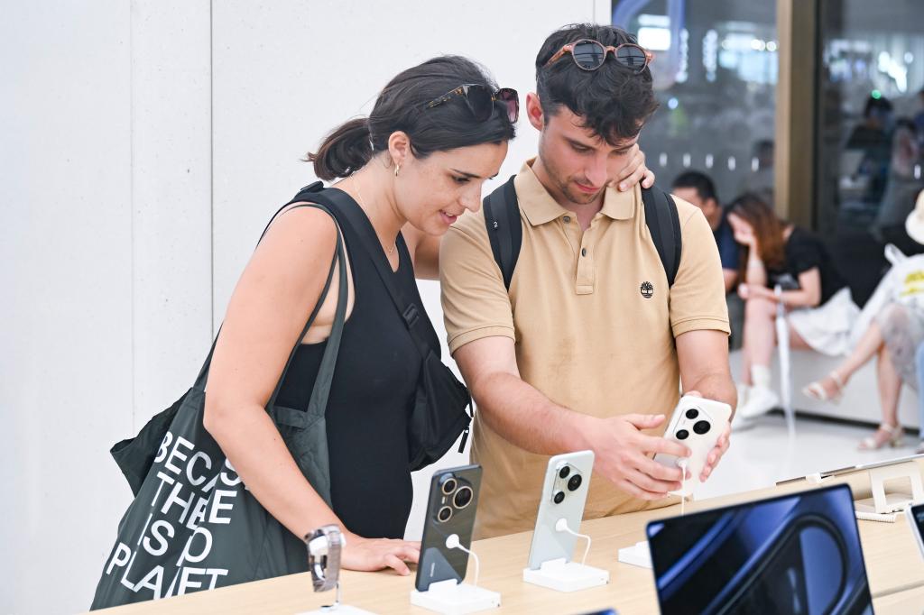 7月17日,两名西班牙游客在位于上海市南京路步行街的华为商店里浏览手机产品。新华社记者 陈浩明 摄