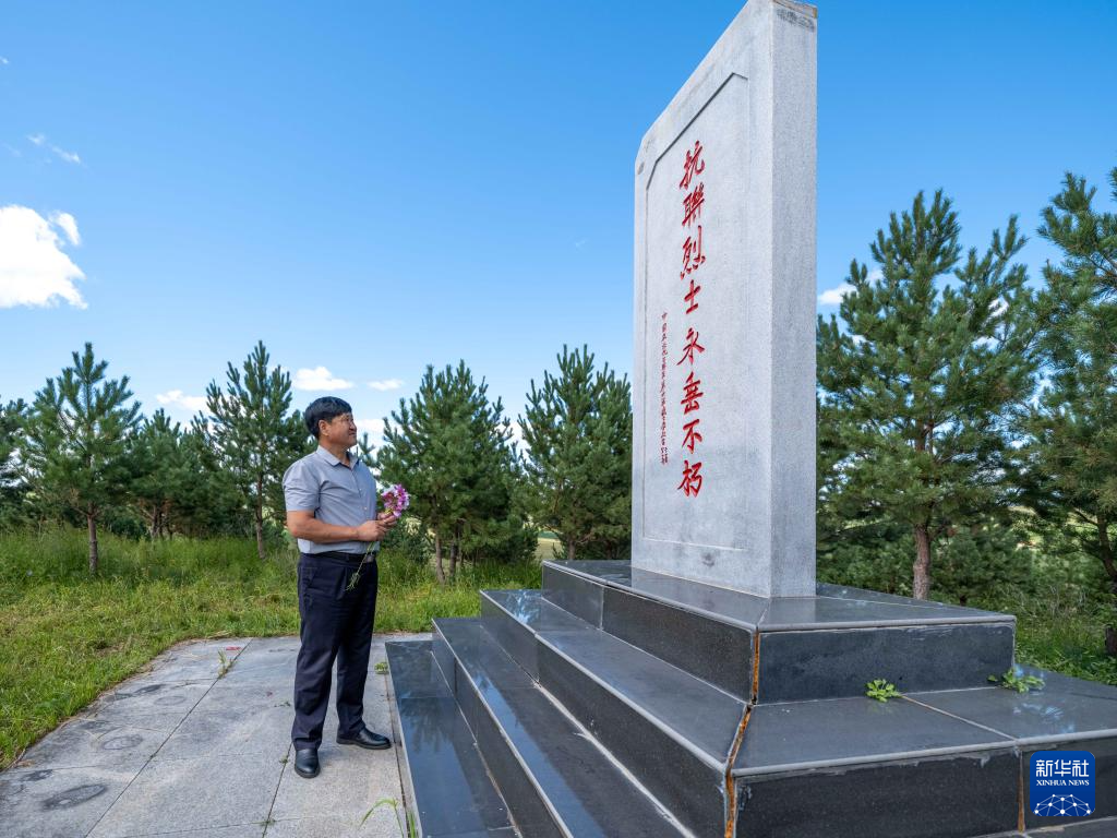 8月23日,内蒙古呼伦贝尔市阿荣旗六合镇,孙福贵在“红军岗”上为抗联烈士纪念碑献花。