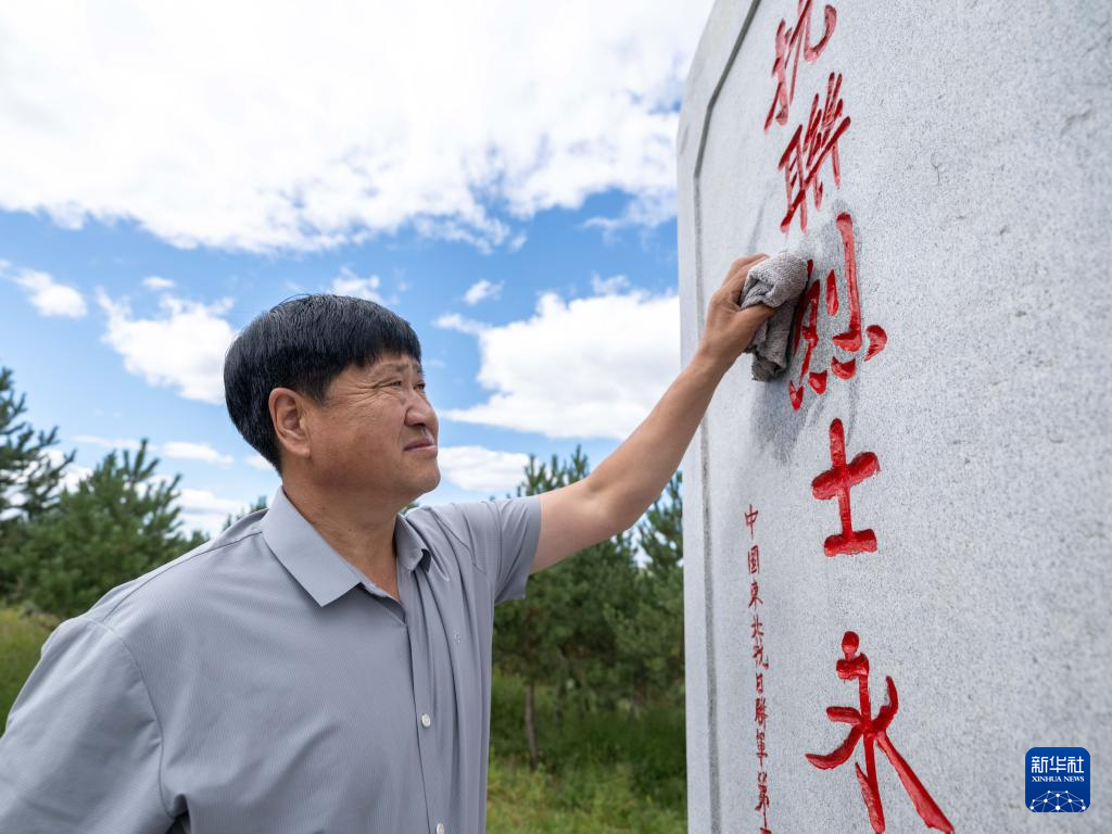 8月23日,内蒙古呼伦贝尔市阿荣旗六合镇,孙福贵在“红军岗”上擦拭东北抗联烈士纪念碑。