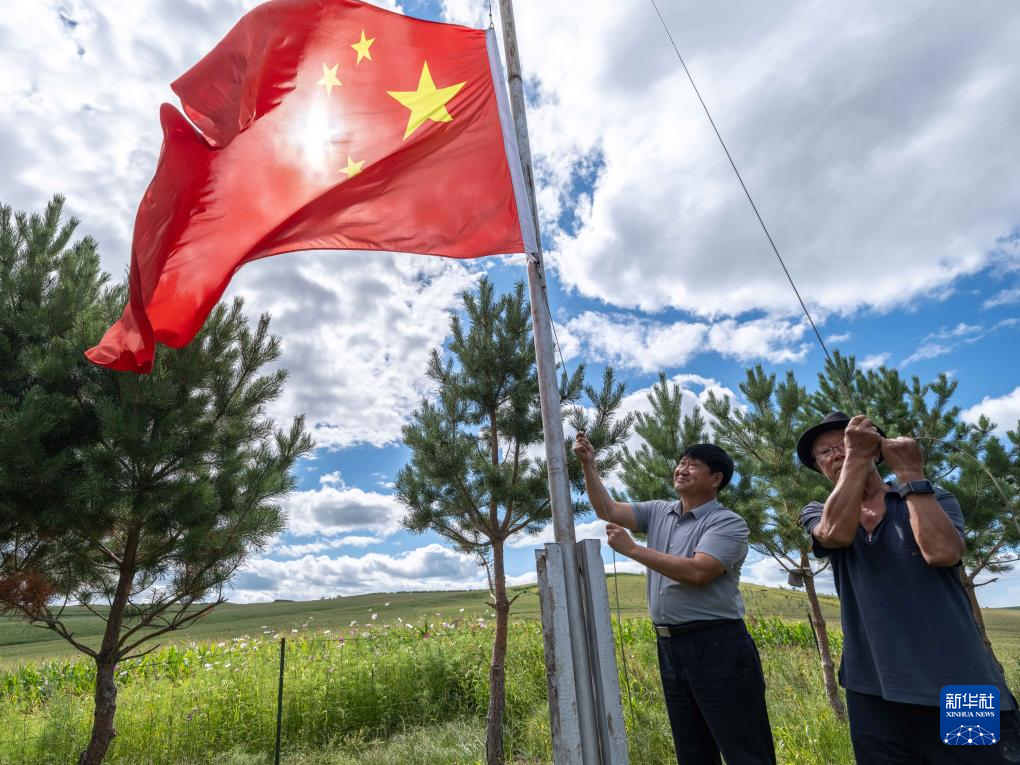 8月23日,内蒙古呼伦贝尔市阿荣旗六合镇,孙福贵(左)与村民李洪海在“红军岗”上升旗。