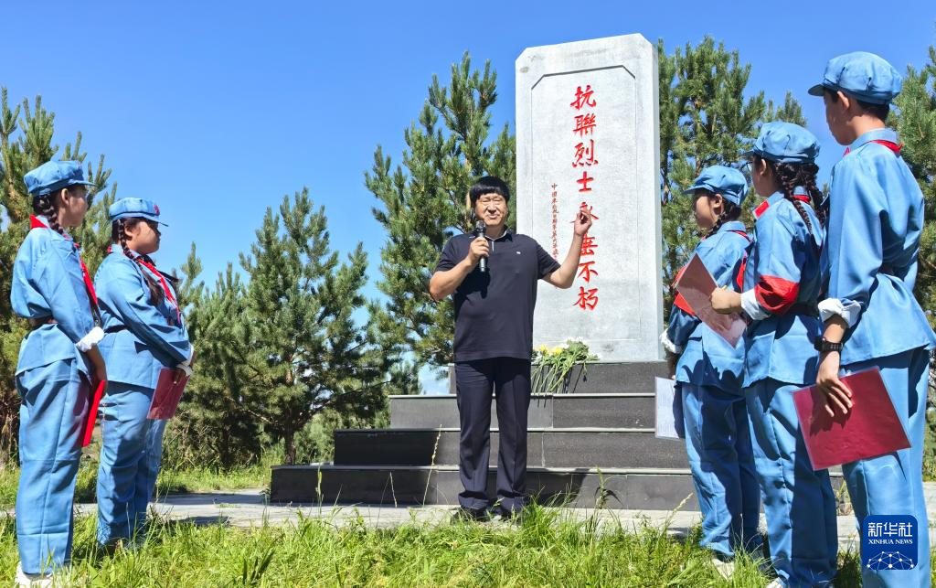 8月14日,内蒙古呼伦贝尔市阿荣旗六合镇,孙福贵(中)在“红军岗”上向参加“重走抗联路”活动的学生讲述东北抗联的事迹。