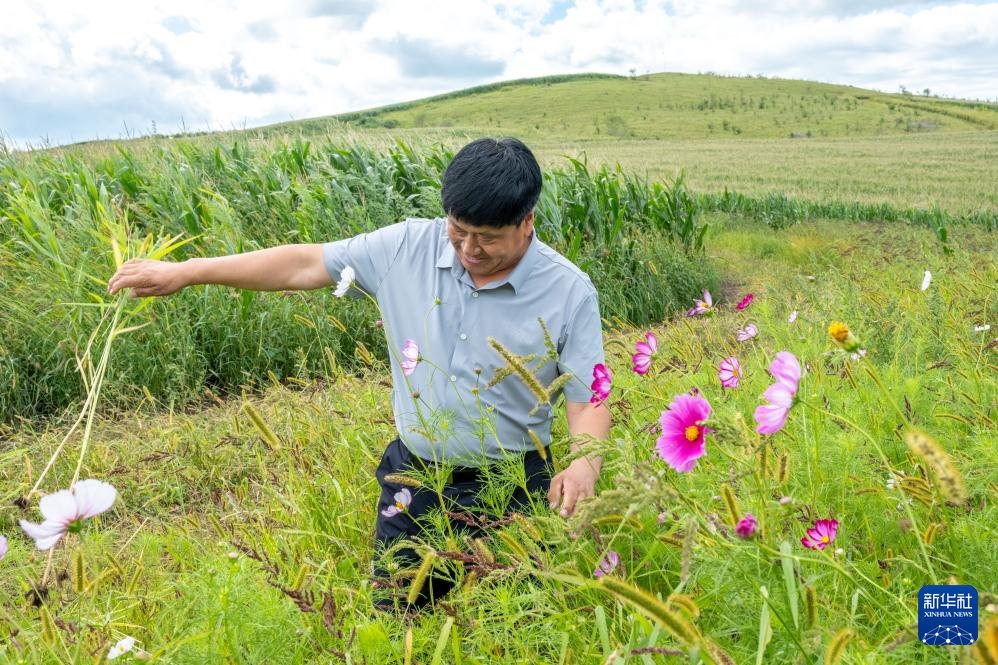 8月23日,内蒙古呼伦贝尔市阿荣旗六合镇,孙福贵在“红军岗”上打理他为烈士墓园种植的格桑花。