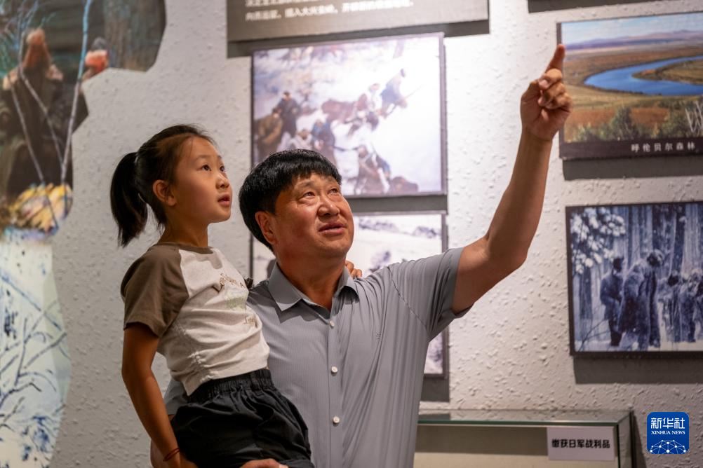 8月23日,内蒙古呼伦贝尔市阿荣旗,孙福贵在呼伦贝尔东北抗联纪念馆向孙女讲述东北抗联在呼伦贝尔地区进行敌后游击的事迹。
