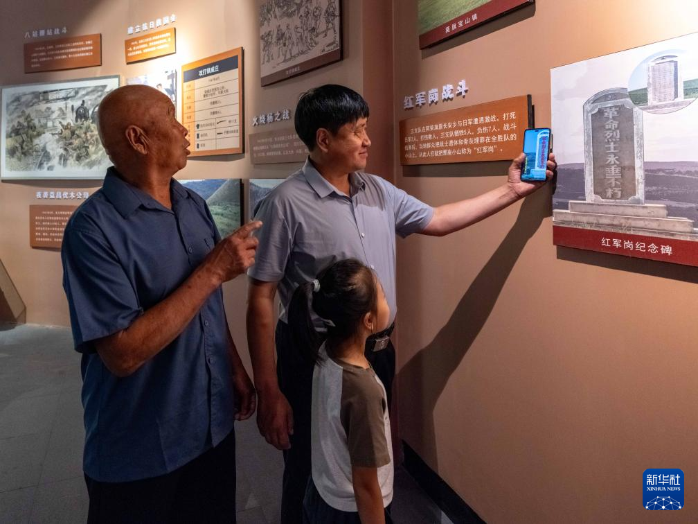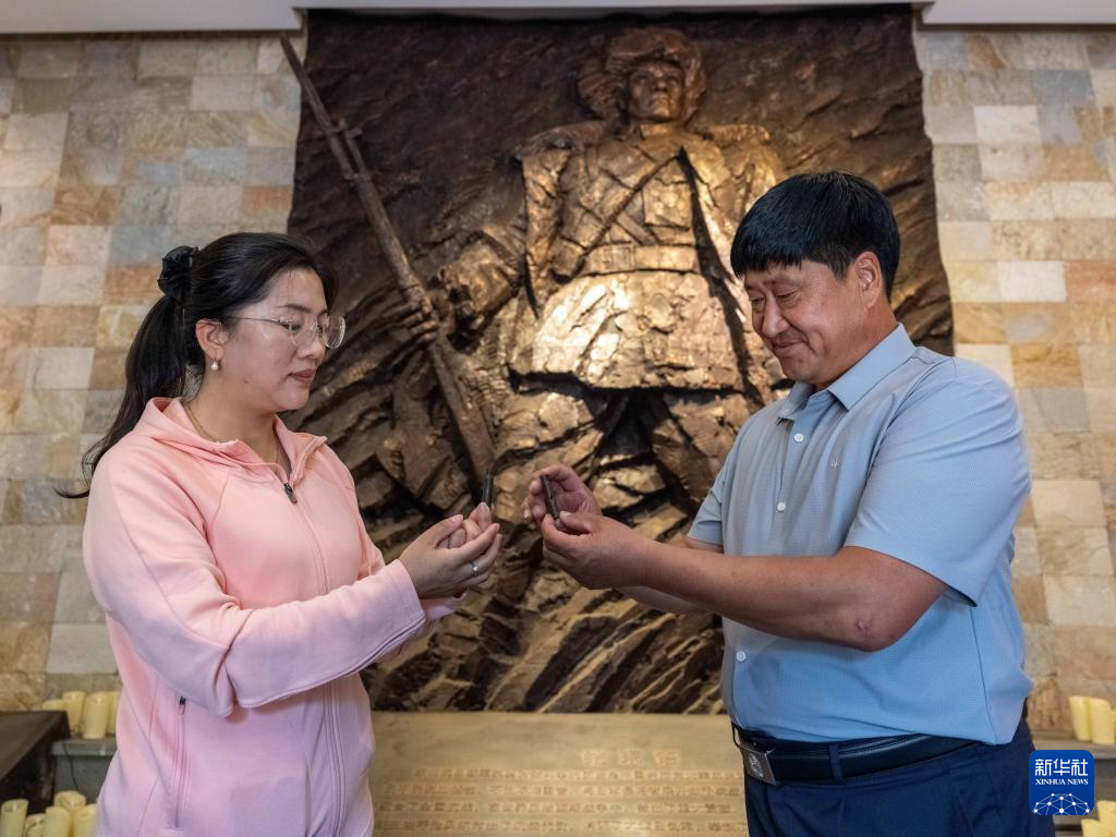 8月23日,内蒙古呼伦贝尔市阿荣旗,孙福贵(右)在呼伦贝尔东北抗联纪念馆中向家人展示由他粉刷的老纪念碑。