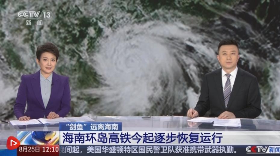 央视网消息:据记者了解到的最新消息,由于台风“剑鱼”影响逐渐减弱,海南部分公共交通将逐步恢复运行。上午11点半开始,海口市域列车、海南环岛高铁陆续恢复。8月25日下午2点50分开始,三乐旅游铁路也将恢复运行。