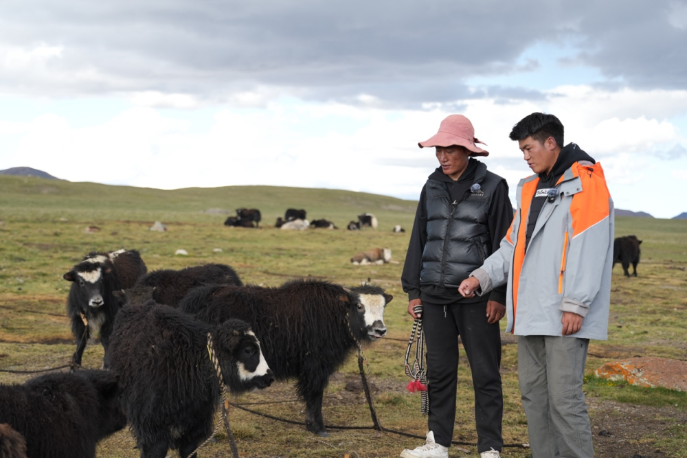 ??图为巴登求扎团队工作人员查看牧区牦牛情况。何欣然摄
