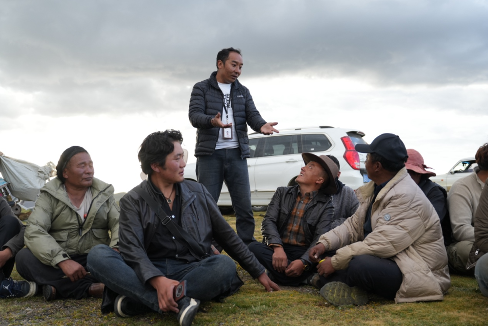 ??图为巴登求扎团队工作人员与牧民交谈。 何欣然摄
