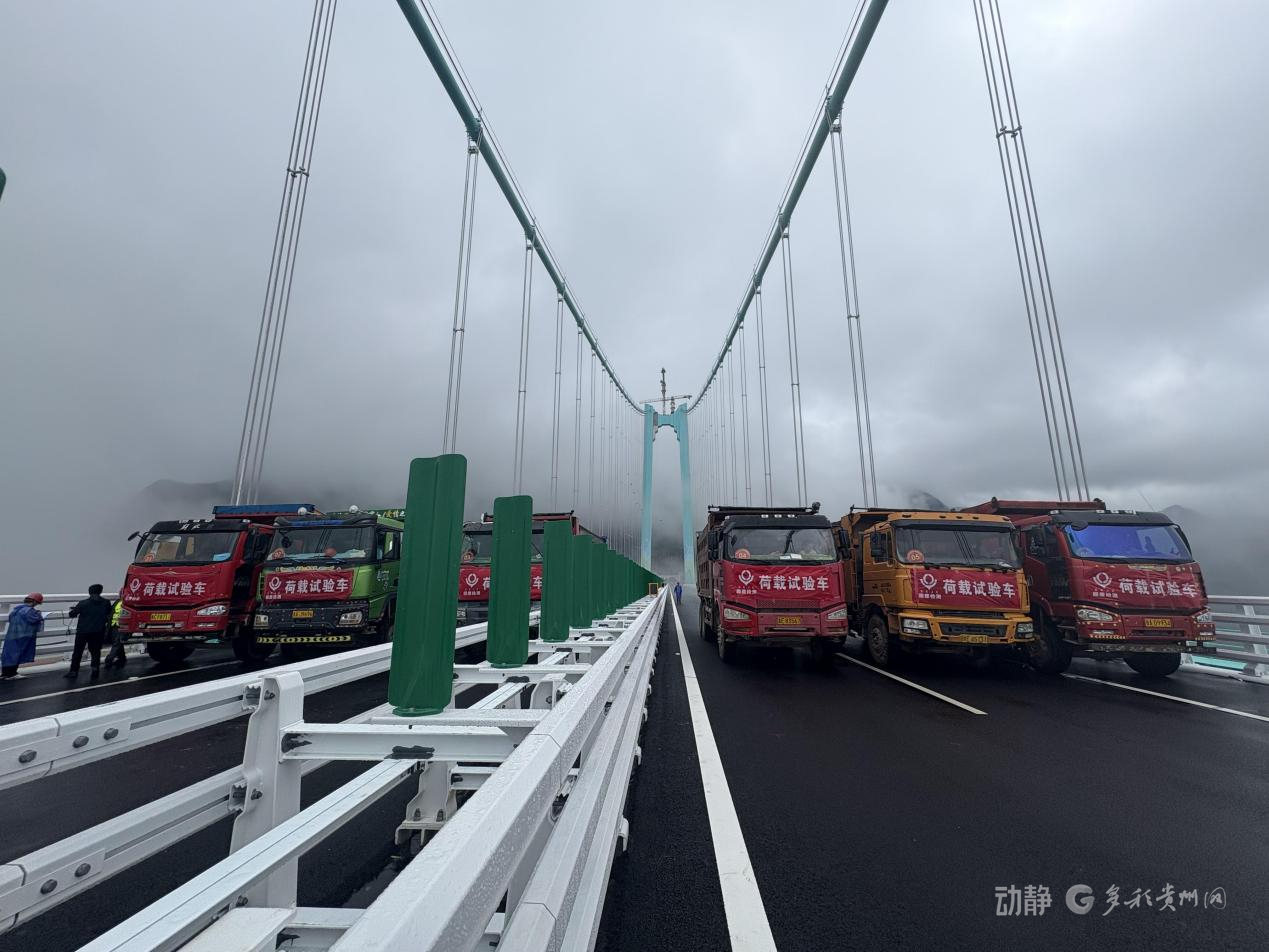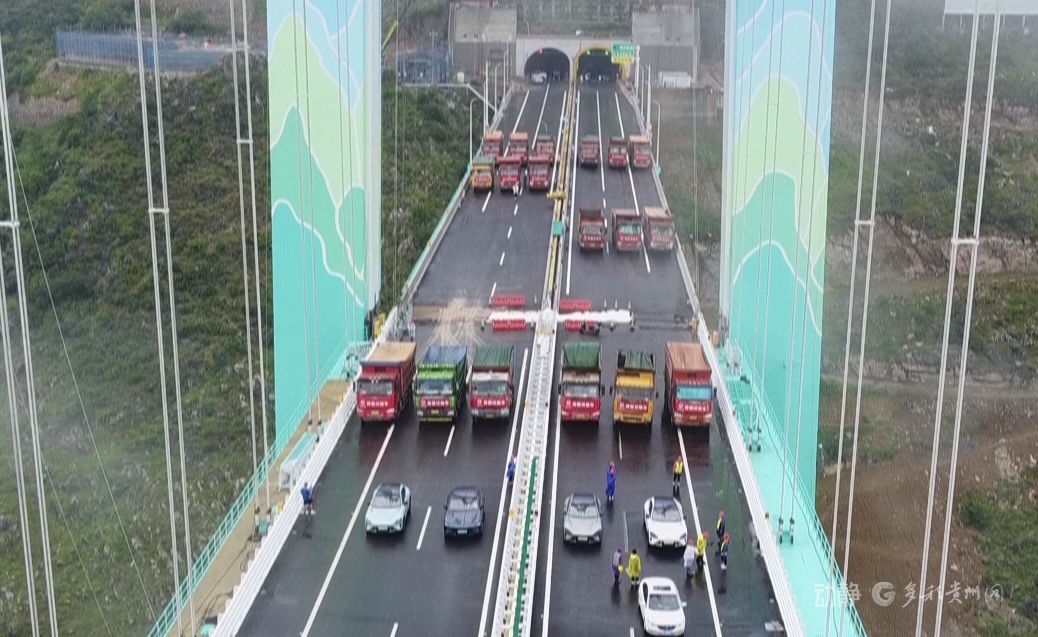 花江峡谷大桥启动荷载试验8月21日,随着6辆35吨的三轴载重车率先驶上桥面,花江峡谷大桥荷载试验正式启动,迎来通车前的“关键大考”。