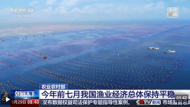 农业农村部数据显示,1到7月,我国水产品总产量近3600万吨,同比增长4.37%。