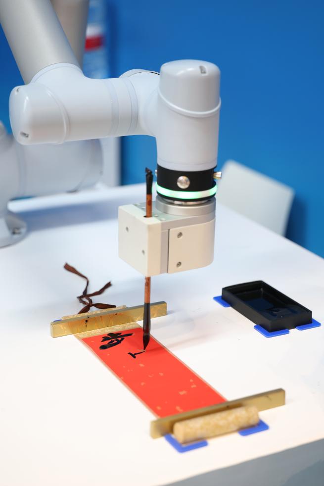 在2025年上海合作组织峰会新闻中心,智能机器人进行书法展示。新华社记者杨青摄