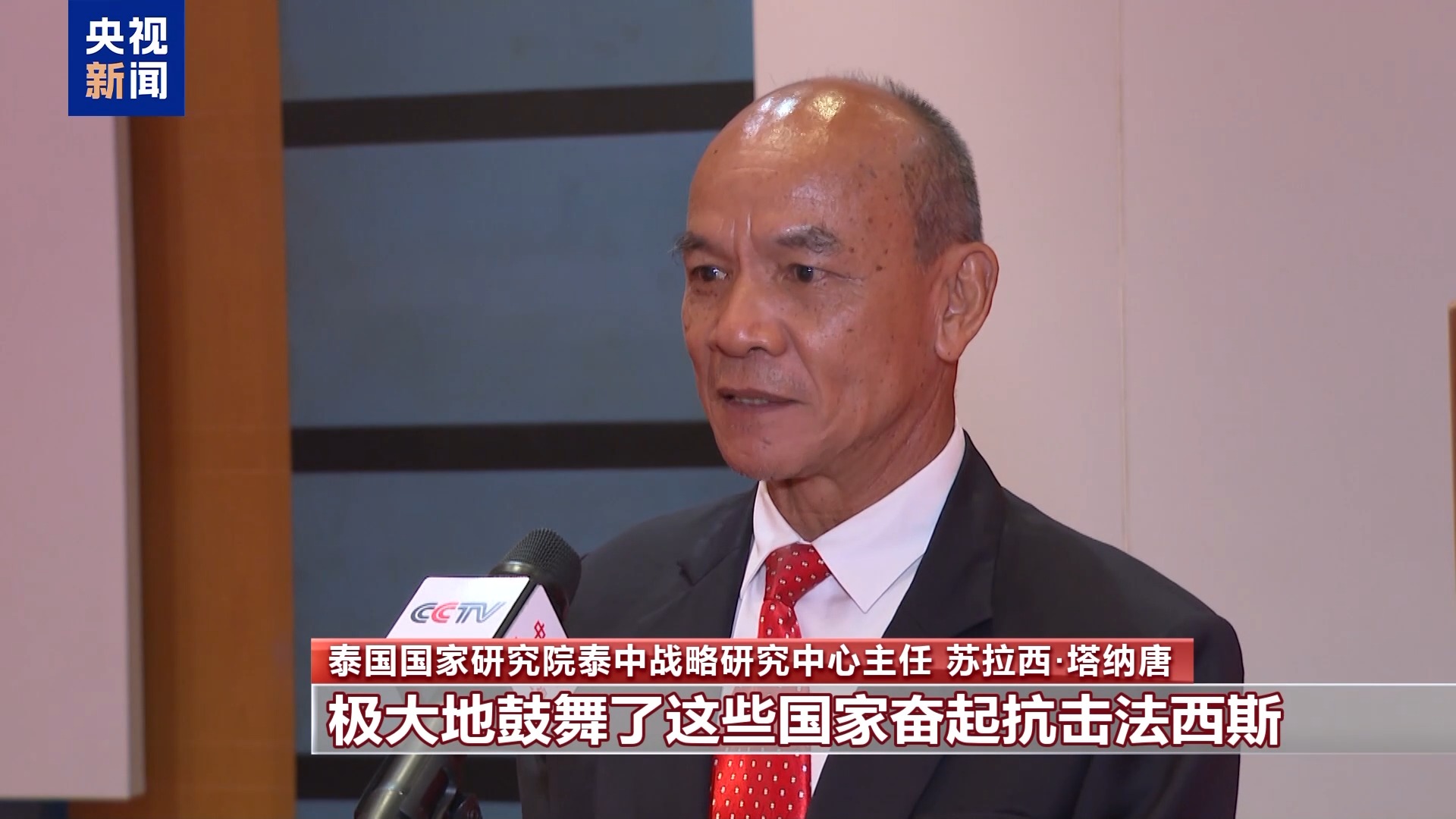 泰国国家研究院泰中战略研究中心主任 苏拉西·塔纳唐:这次纪念活动会让我们看到中国军队的威武雄壮,同时回忆那段令中国人民和军队付出巨大牺牲的历史。抗日战争的胜利是在中国共产党的领导下取得的。中国人民抗日战争是重要的历史转折点,为当时处于法西斯和日本军国主义侵略和殖民的其他国家带来了希望的曙光,令他们看到中国人民和军队的坚忍不屈和付出的巨大牺牲,极大地鼓舞了这些国家奋起抗击法西斯和驱逐日本侵略者的信心。