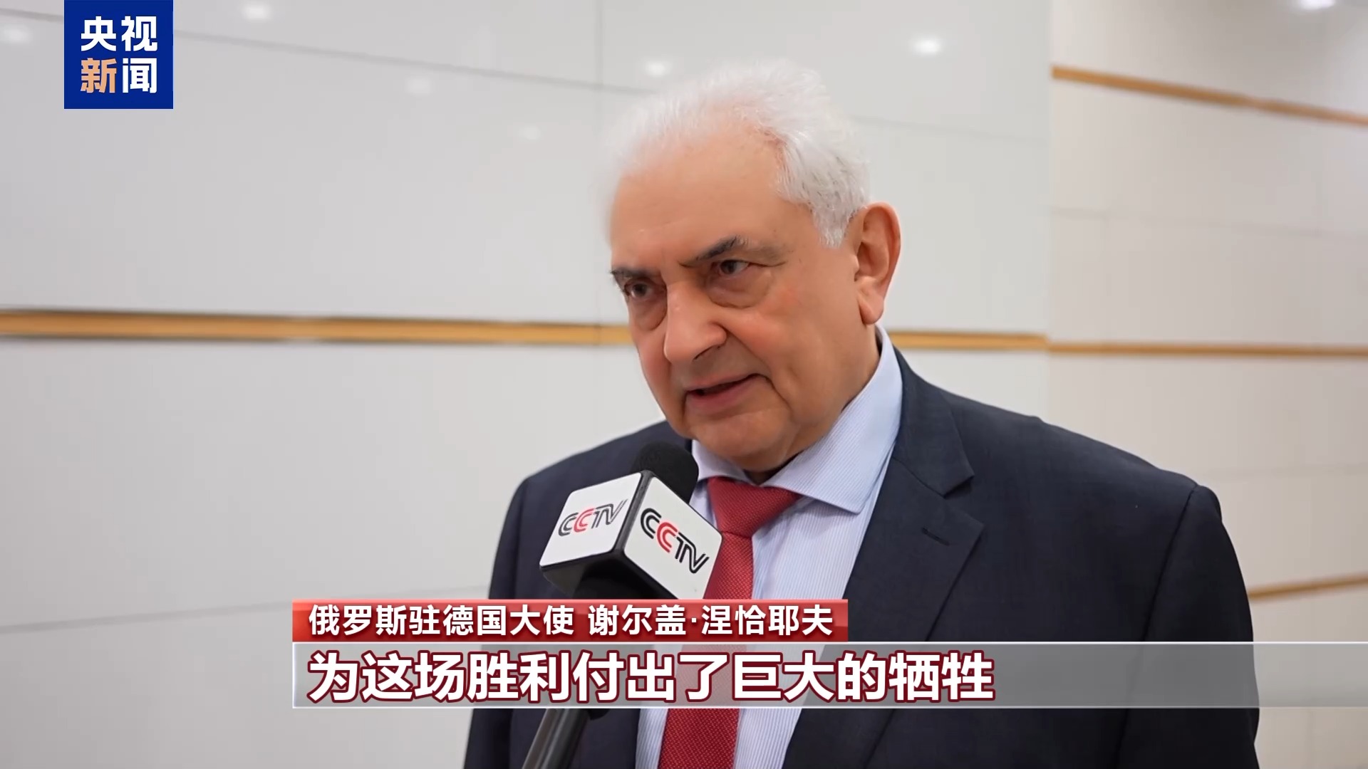 俄罗斯驻德国大使 谢尔盖·涅恰耶夫:我们知道,我们的中国兄弟为这场胜利付出了巨大的牺牲。我们也一样,苏联为战胜纳粹主义,也付出了2700万人的牺牲。我们将热泪盈眶地共同纪念这个日子。