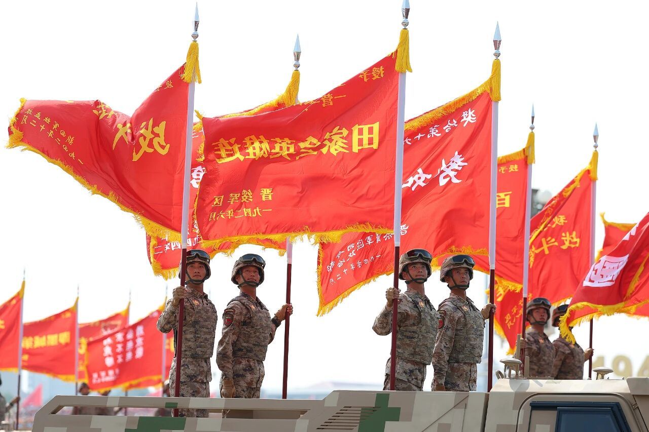 80面抗战英模部队荣誉旗帜组成战旗方队