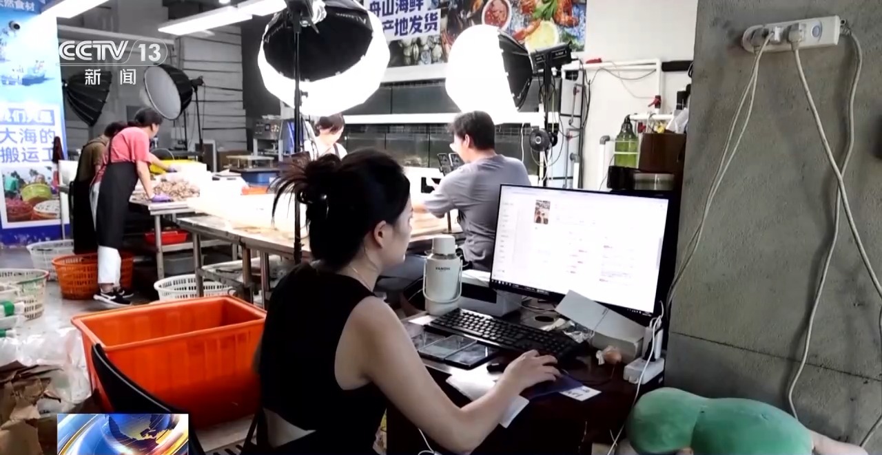 渔船忙着卸货的同时,在距离码头不远的电商产业园里,主播们正售卖新鲜上市的梭子蟹。为了缩短发货时间,这家店铺在直播的同时打包海鲜,即买即发,每天可以发出六到七百个订单。