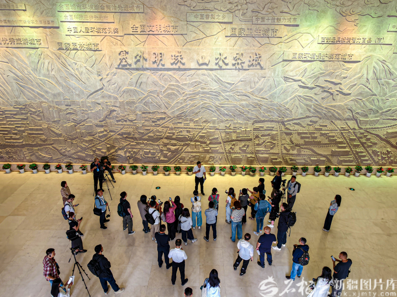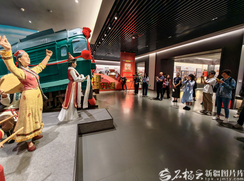 9月8日,在巴州铸牢中华民族共同体意识主题展馆,采访团拍摄南疆火车通车雕塑。