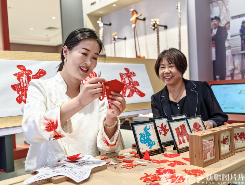 9月8日,剪纸艺人在巴州铸牢中华民族共同体意识主题展馆表演剪纸技艺。
