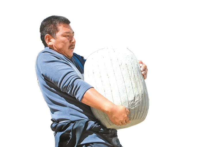 图为参赛队员全力抱起石头,这是力量的完美展现。