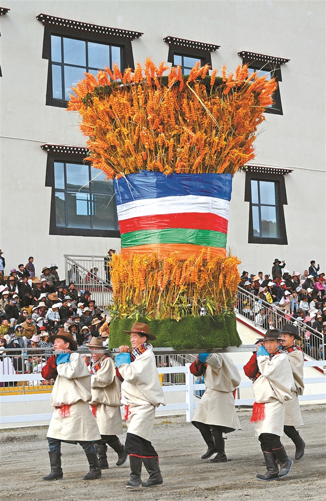 图为寓意丰收的青稞方队入场。
