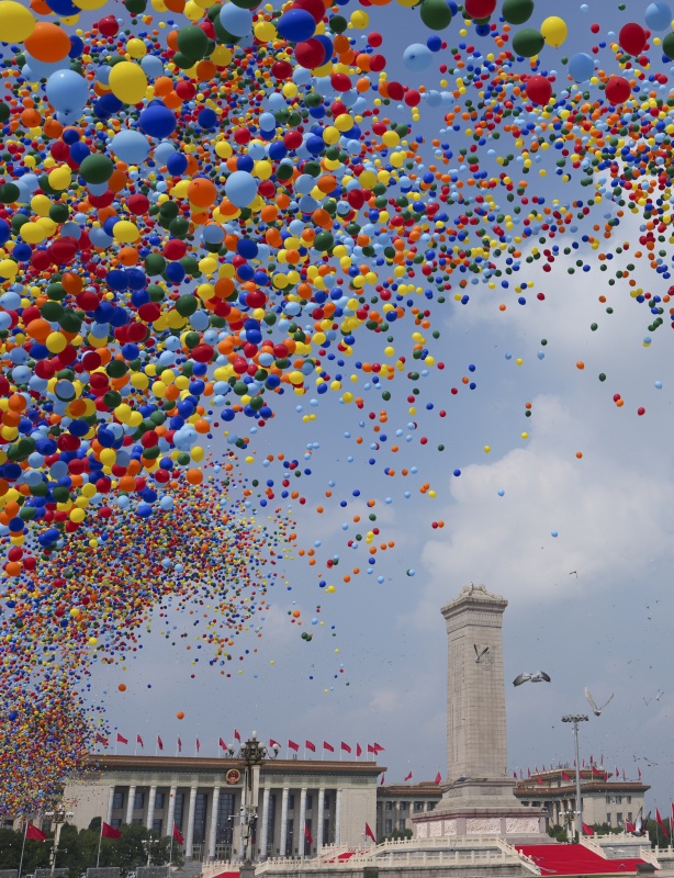 2025年9月3日,纪念中国人民抗日战争暨世界反法西斯战争胜利80周年大会在北京隆重举行。这是纪念大会现场放飞气球和鸽子。新华社发