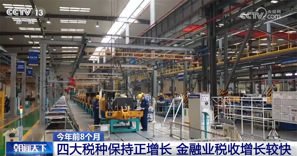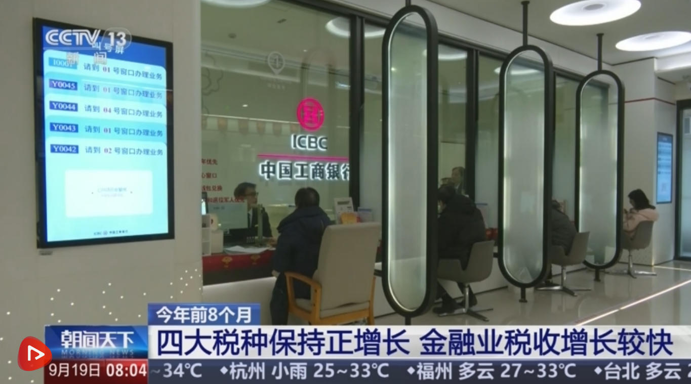 央视网消息:国家税务总局数据显示,今年前八月,四大税种均保持正增长,金融业税收增长较快。