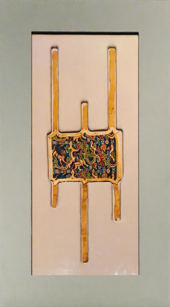这是2025年5月9日在新疆维吾尔自治区博物馆拍摄的汉代“五星出东方利中国”锦护臂。新华社记者 徐宏岩 摄