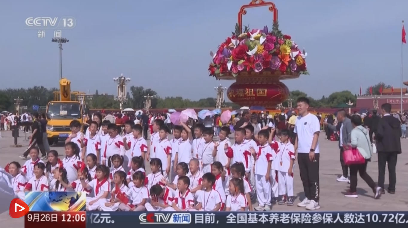 为迎接国庆,北京天安门广场及长安街沿线花卉景观布置基本就绪。9月25日,天安门广场中心花坛盛装亮相。今年广场花卉布置以“奋进新征程,建功新时代”为主题,中心花坛顶高18米。以高16米、直径12米的“祝福祖国”巨型花篮为主景。其中,加大了鸢尾、翠菊、珙桐、橄榄枝等新型花材的使用。此外,还有寓意和美的荷花、以及寓意奋进的山丹丹等花卉,表达美好祝愿。