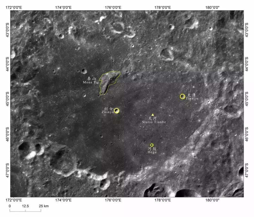 2019年2月4日,国际天文学联合会(IAU)批准了利用探月工程嫦娥二号和嫦娥四号高分辨月面影像数据申报的嫦娥四号着陆点及附近5个月球地理实体名称:天河基地、织女、河鼓、天津、泰山。这是我国月球探测工程科学数据成果在月球地理实体命名上的又一次重要应用。至此,国际天文学联合会(IAU)公布的月球地名中,有27个以中国元素命名的月球地形单元。