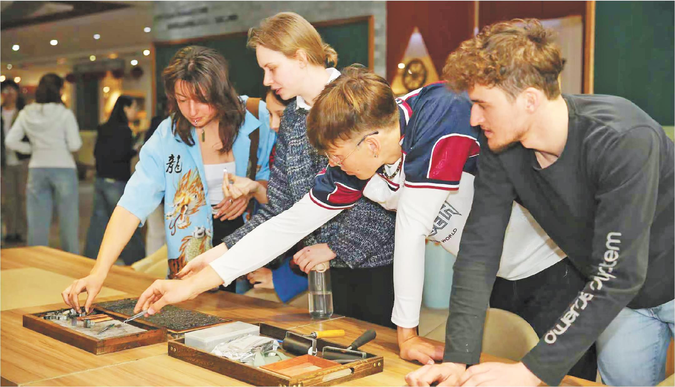 2025“国际中文日”活动上,留学生在体验活字印刷。(□通讯员孔勇报道)