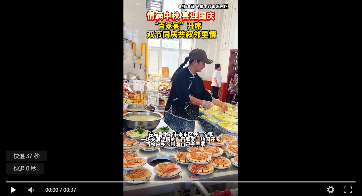 新疆广播电视台/丝路视听讯 (记者:于美玲 李新刚 )中秋与国庆相拥,团圆与欢歌同行。在乌鲁木齐市米东区铁厂沟镇,一场充满乡土温情的“百家宴”热闹开席,百余户乡亲带着自己拿手家常菜赴约,用饭菜香、邻里情,勾勒出双节喜庆氛围。