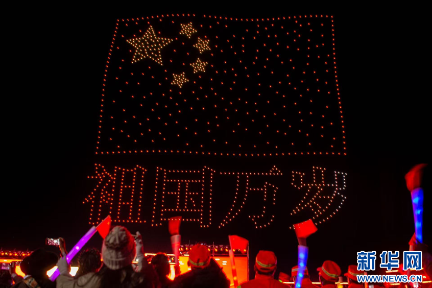 图为第九届象雄文化旅游节开幕式现场的无人机表演(9月26日摄)。新华网 柑丹鸯琦摄