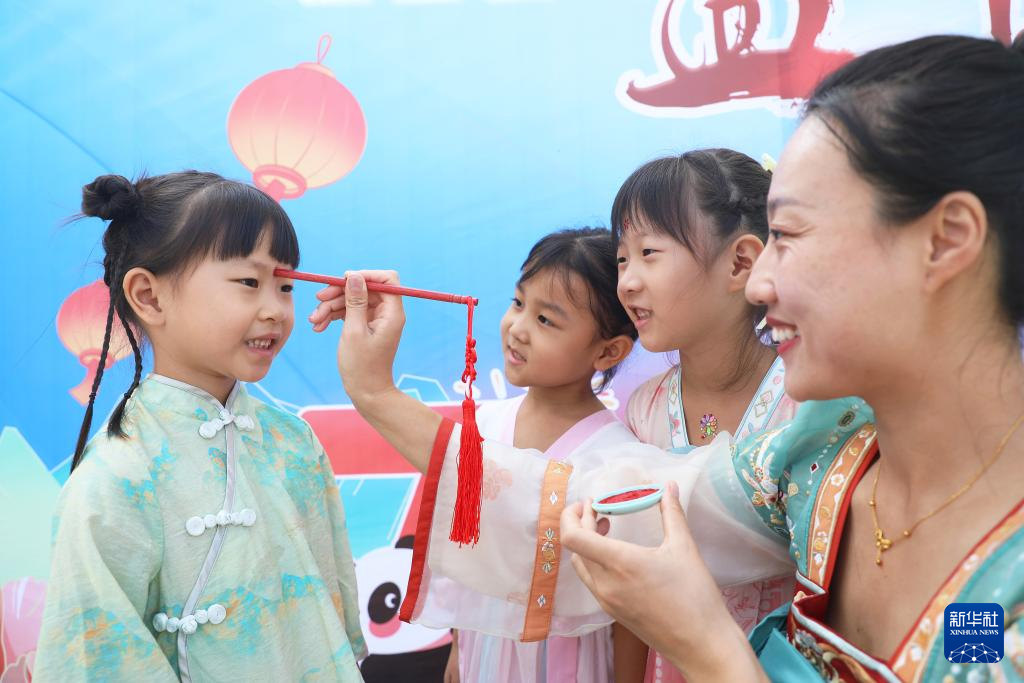9月29日,在河北省唐山市丰润区新城道幼儿园举行的“花好月圆 古韵迎中秋”主题活动中,老师为小朋友点朱砂。