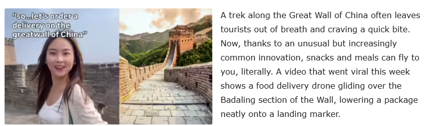 全球媒体聚焦 | 外卖“飞”到长城 外媒热议中国“低空经济”领跑全球