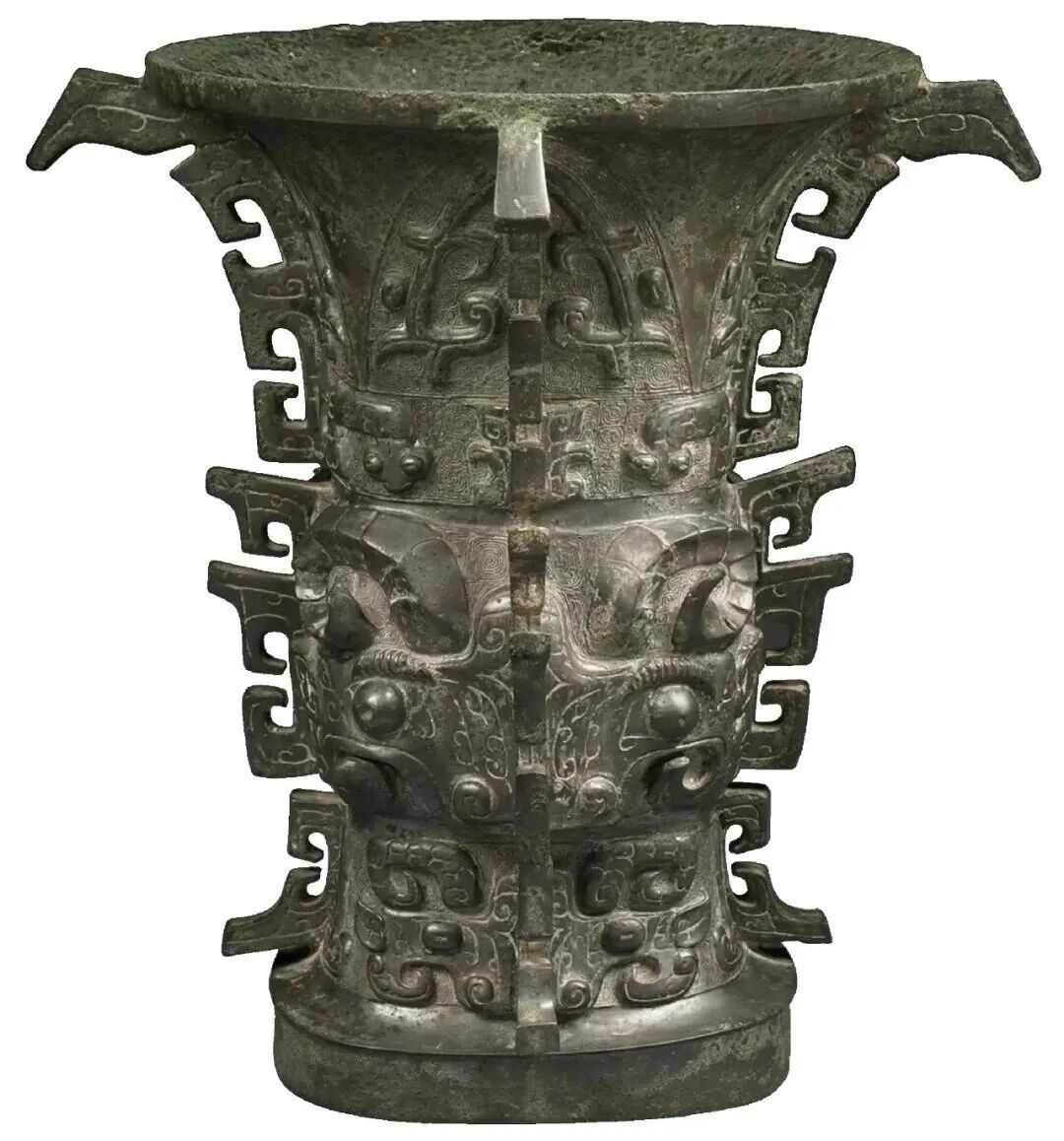 何尊是西周早期盛酒器,通高38.5厘米,重14.6千克。1963年出土于陕西宝鸡贾村镇。何尊造型优美,上圆下方,通体有四道扉棱,上部纹饰以芭蕉叶和蛇纹点缀,腹部和下部分别饰以高浮雕、浅浮雕的兽面纹,纹饰疏密有致,凝重而富有变化。何尊铭文内容为西周历史研究和青铜器断代研究提供了重要的实物资料。其中,何尊铭文中的“宅兹中国”为目前所知“中国”一词最早的文字记载。