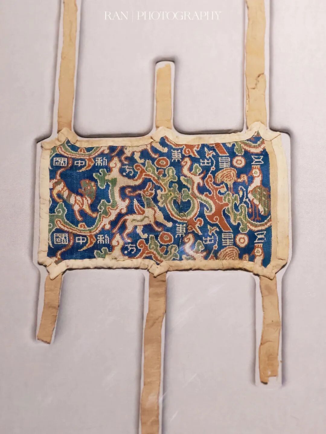 “五星出东方利中国”锦护臂呈圆角长方形,鲜艳蓝底上织绣了红、黄、绿、白色花纹,合为五色,勾勒出凤凰、鸾鸟、麒麟、白虎的形状,8个篆体汉字“五星出东方利中国”巧妙排列其中。织锦的颜色、花纹全部由经线承担,纬线只起固定作用,代表了汉代织造技艺的最高水平。