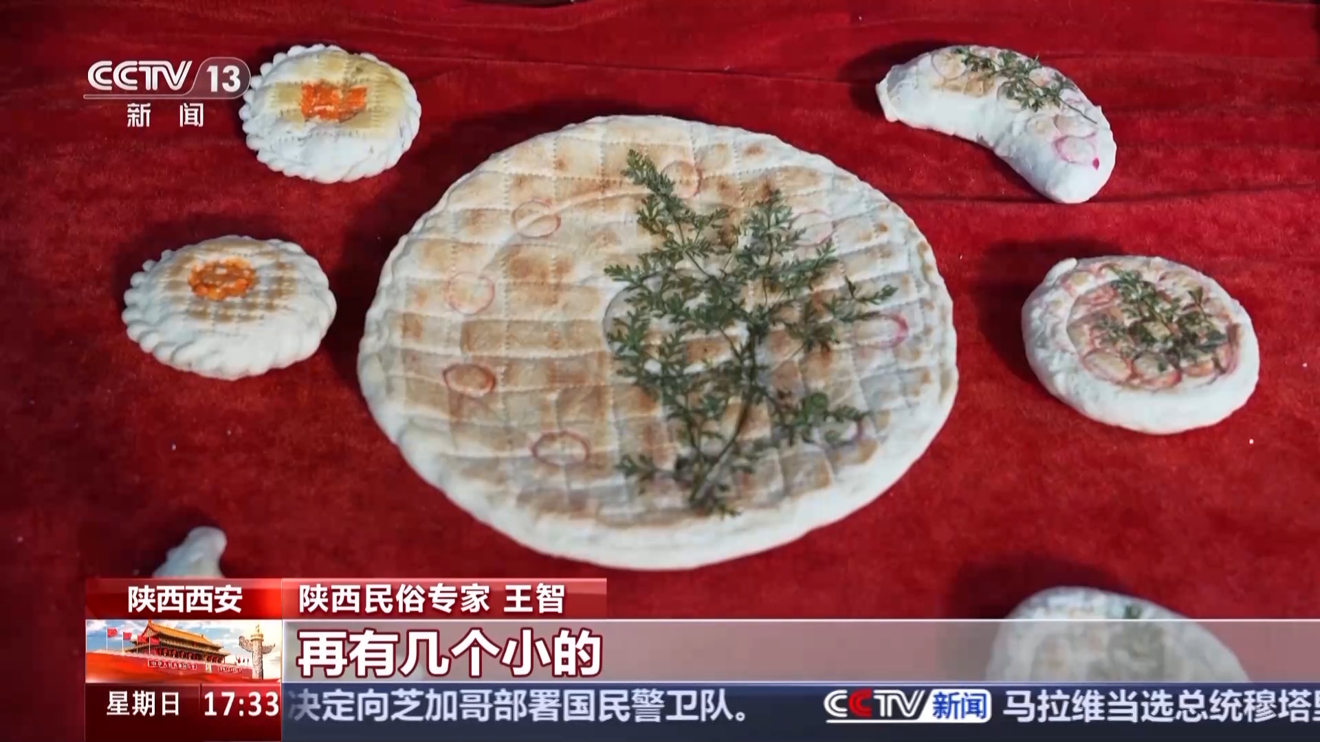 陕西民俗专家 王智:关中民间老百姓自古传说最古老的那个月饼,它有个名字叫团圆馍,这个团圆馍一般是有一个最大的,再有几个小的,象征着一家老少。里头还有月牙状的,还有圆状的。家里有几口人就把它切几块,如果远方游子还在外地,把这一块给他留上,用红绫子包上挂上等他回来吃,处处体现了团圆。