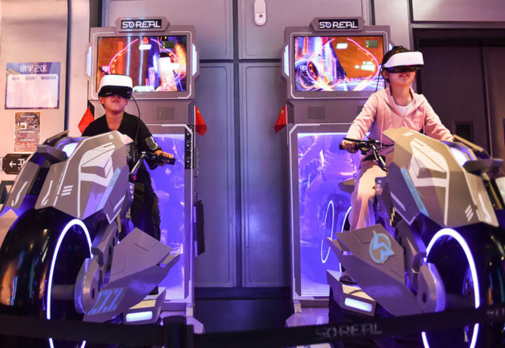 10月4日,在河南省洛阳市涧西区未来城科幻乐园内,孩子们在体验VR虚拟技术沉浸式场景。新华社发(黄政伟摄)