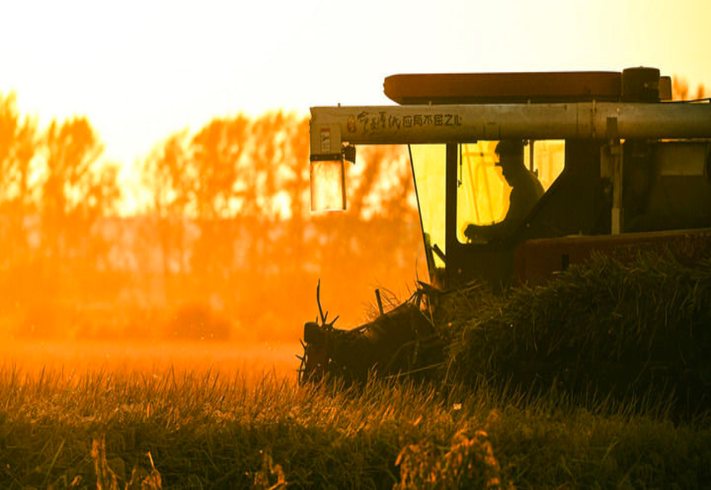 10月3日,农户在北大荒集团黑龙江八五六农场有限公司第五管理区抢收水稻(无人机照片)。国庆中秋假期,大江南北,许多劳动者坚守岗位、辛勤工作,默默奉献。新华社发(黄永兴摄)