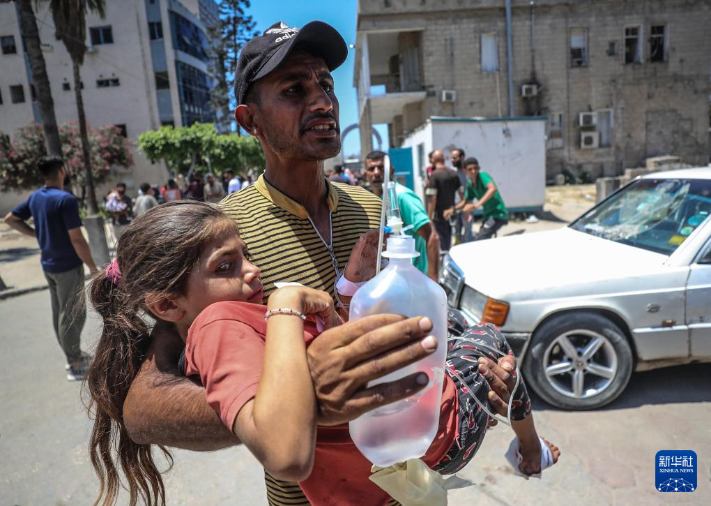 2025年7月13日,在加沙城一所医院,一名男子怀抱在以军空袭中受伤的女孩。新华社发(马哈茂德·扎基摄)