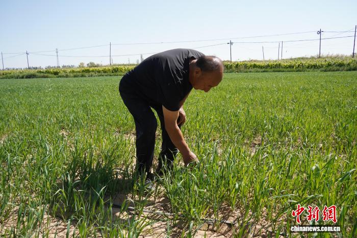 图为许忠厚查看燕麦草生长情况。 侯旭佳 摄