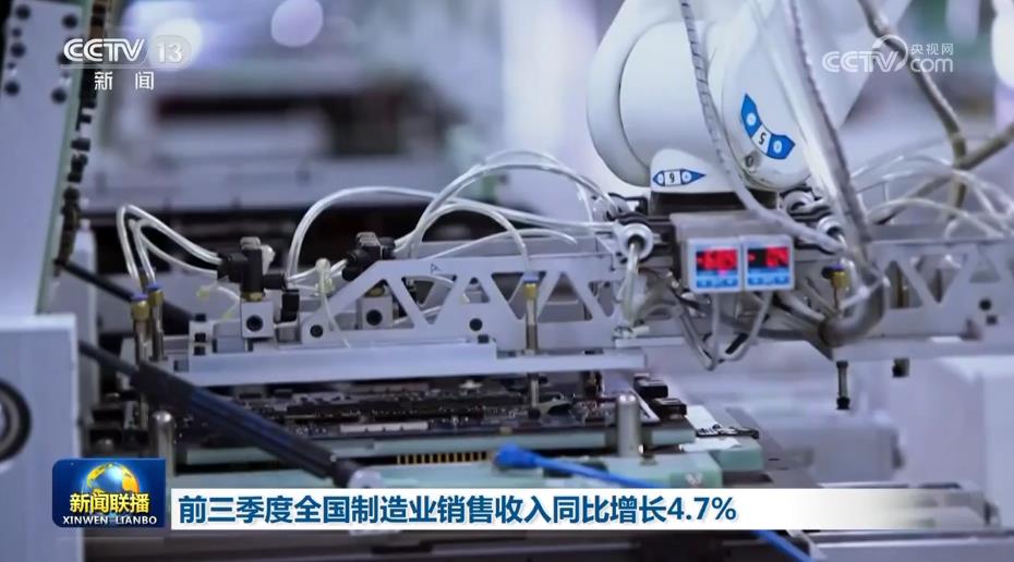 央视网消息(新闻联播):国家税务总局最新增值税发票数据显示,前三季度,制造业高质量发展持续推进,销售收入同比增长4.7%。其中,制造业高端化转型加快,装备制造业销售收入同比增长9%,特别是计算机通信设备、工业母机等制造业销售收入同比分别增长13.5%和11.8%。