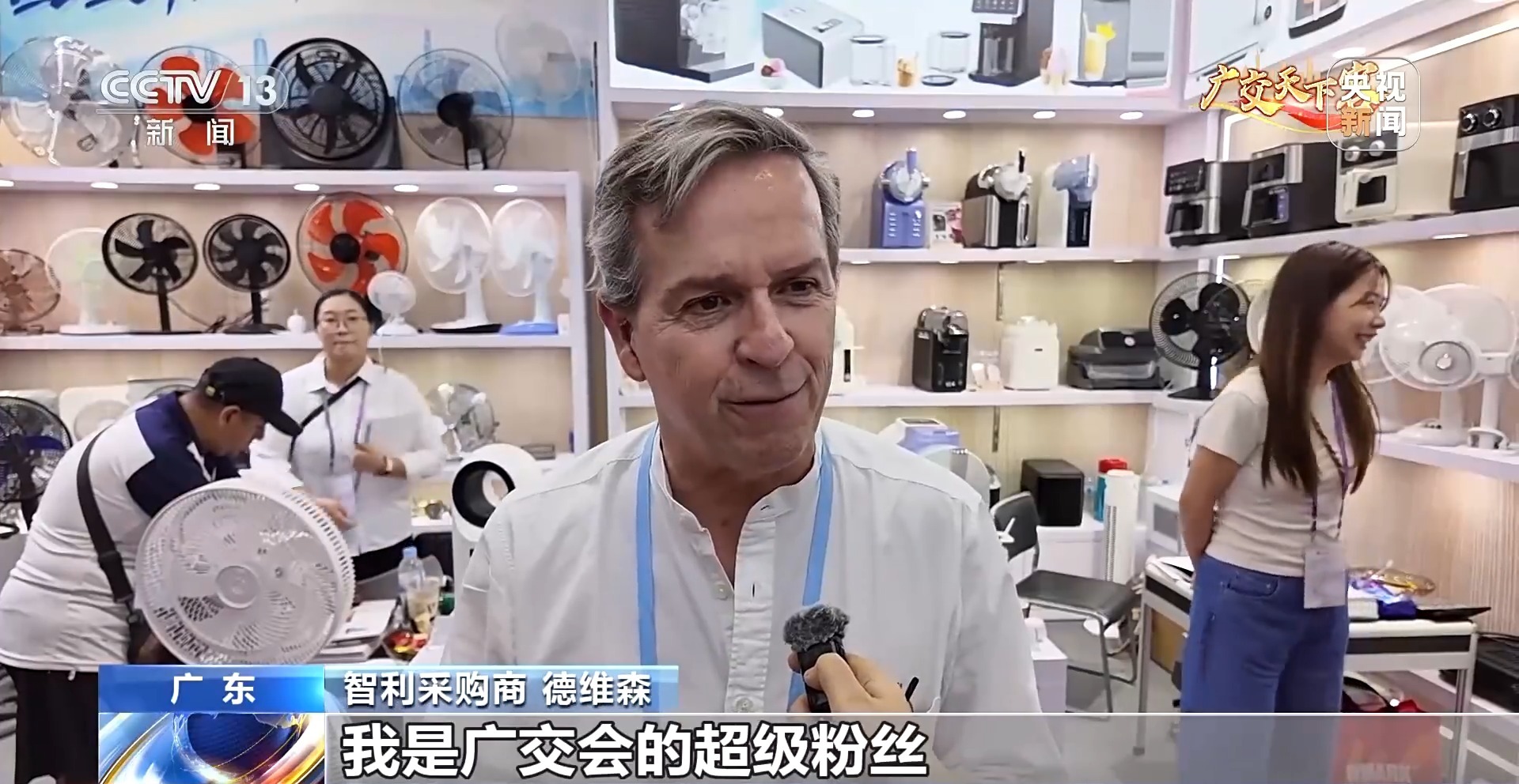 智利采购商 德维森:我是广交会的超级粉丝,我非常佩服中国企业的创新能力,每年我都能找到很多新产品,我们公司每年购买大约四千万到四千五百万美元。