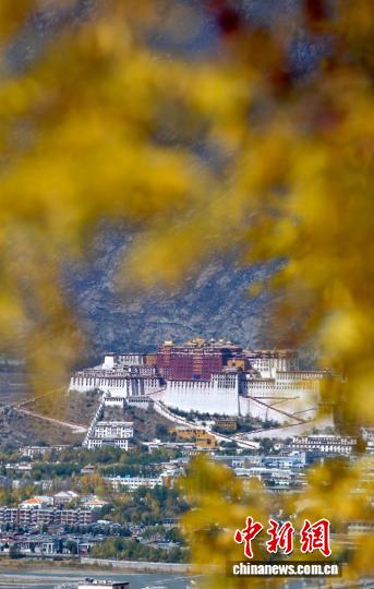 10月20日,西藏拉萨深秋如画。图为拉萨天堂草原自然风景区的黄叶与布达拉宫相映成趣。中新社记者 李林 摄