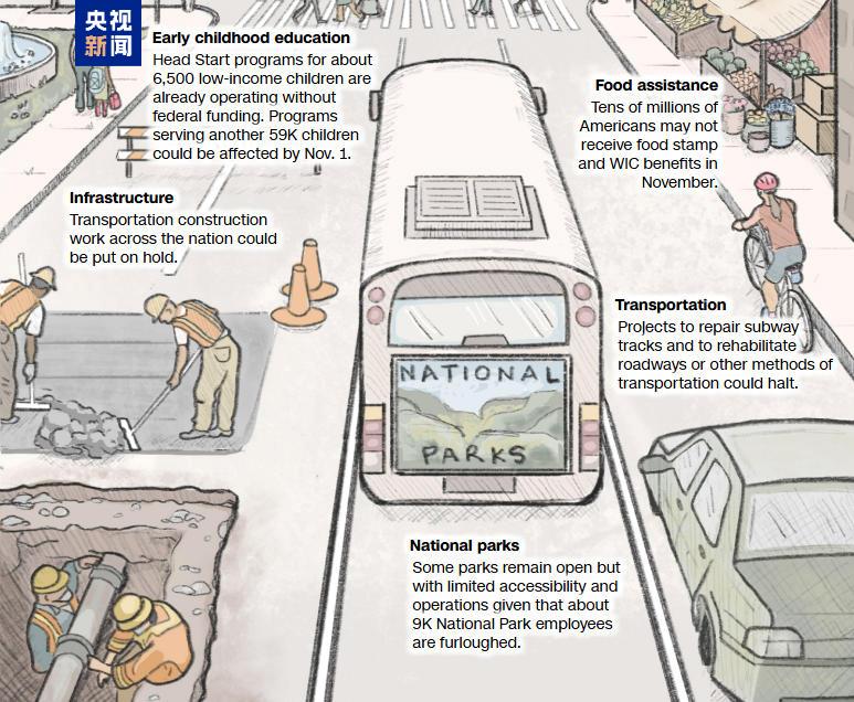 数以千万计的美国人11月可能无法领取食品券和妇女、婴儿和儿童特别营养补充计划的福利;美国全国的交通基础设施建设工作可能会暂停;修复地铁、公路或其他交通运输的项目可能会暂停; 一些国家公园仍然开放,但由于约9000名国家公园员工被迫休假,公园运营能力受到影响。