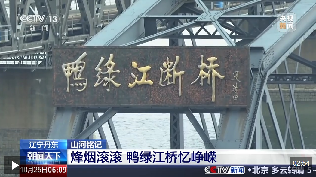 总台记者 闫崎峰:我现在是在中朝友谊桥上,也就是经常说的鸭绿江上桥。在旁边就是鸭绿江断桥,它也通常被称为鸭绿江的下桥。在1950年11月8日到14日,美军出动了100多架战斗机,对这座桥进行了轰炸。在此期间,这座桥被炸断。