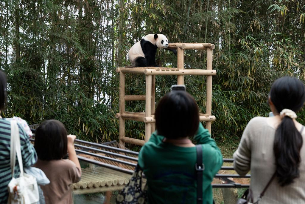 9月30日,游客在韩国龙仁的爱宝乐园观看大熊猫乐宝。新华社发(全休相摄)