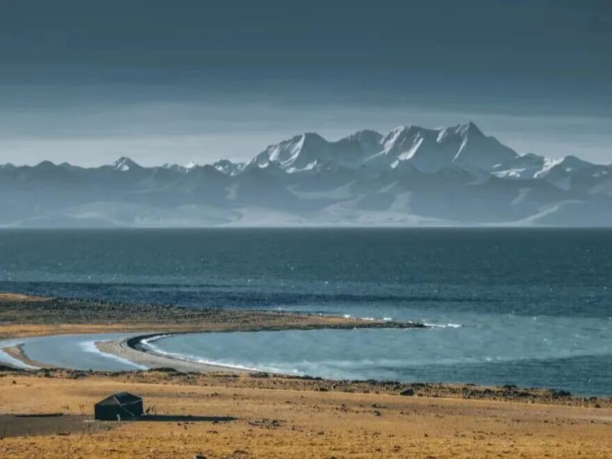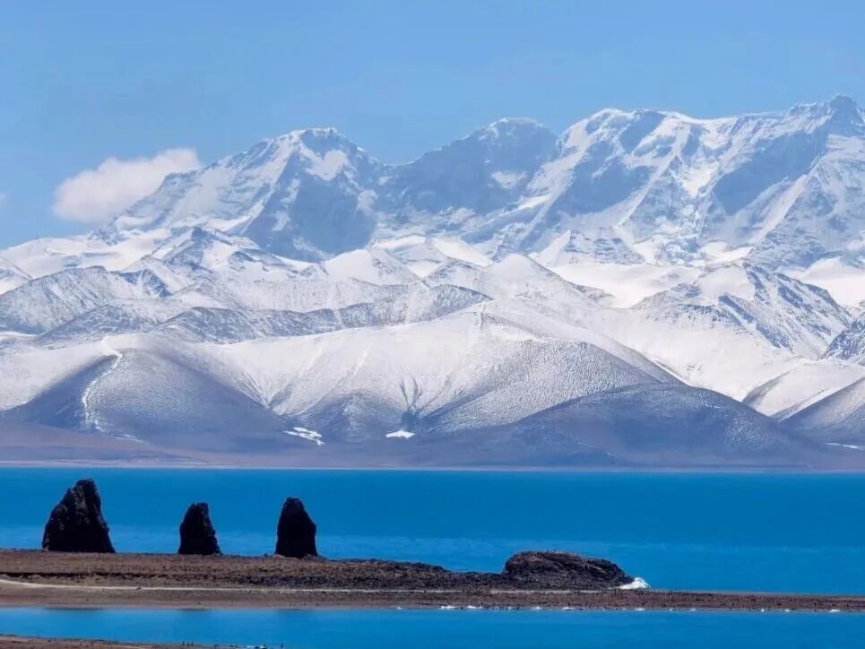 这里能拍出“雪山映湖”的经典画面,远处的念青唐古拉山倒映在湖水中,蓝天白云作为天然背景,构图简单却气势恢宏。