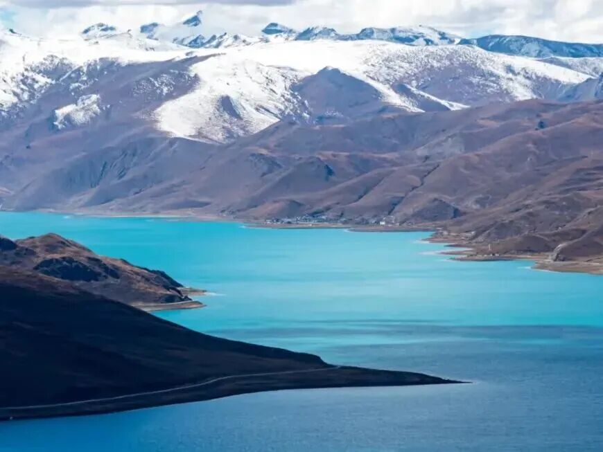 这个角度能同时框住湛蓝的天空、连绵的雪山和蜿蜒的羊湖,层次分明,色彩对比强烈。